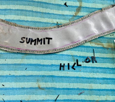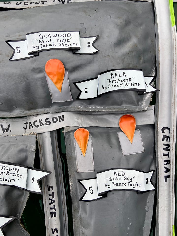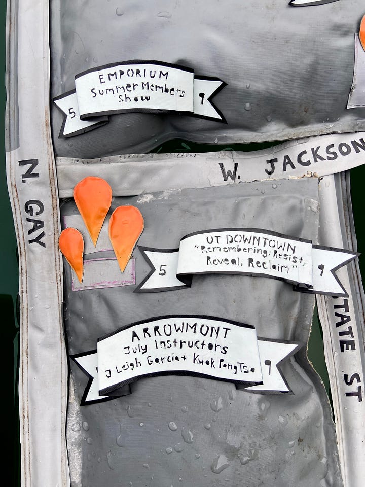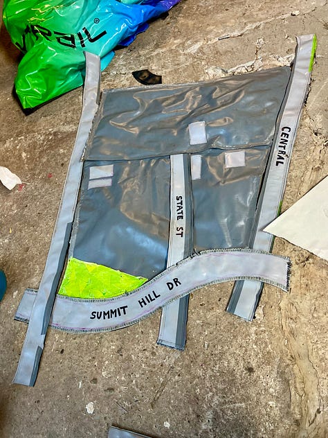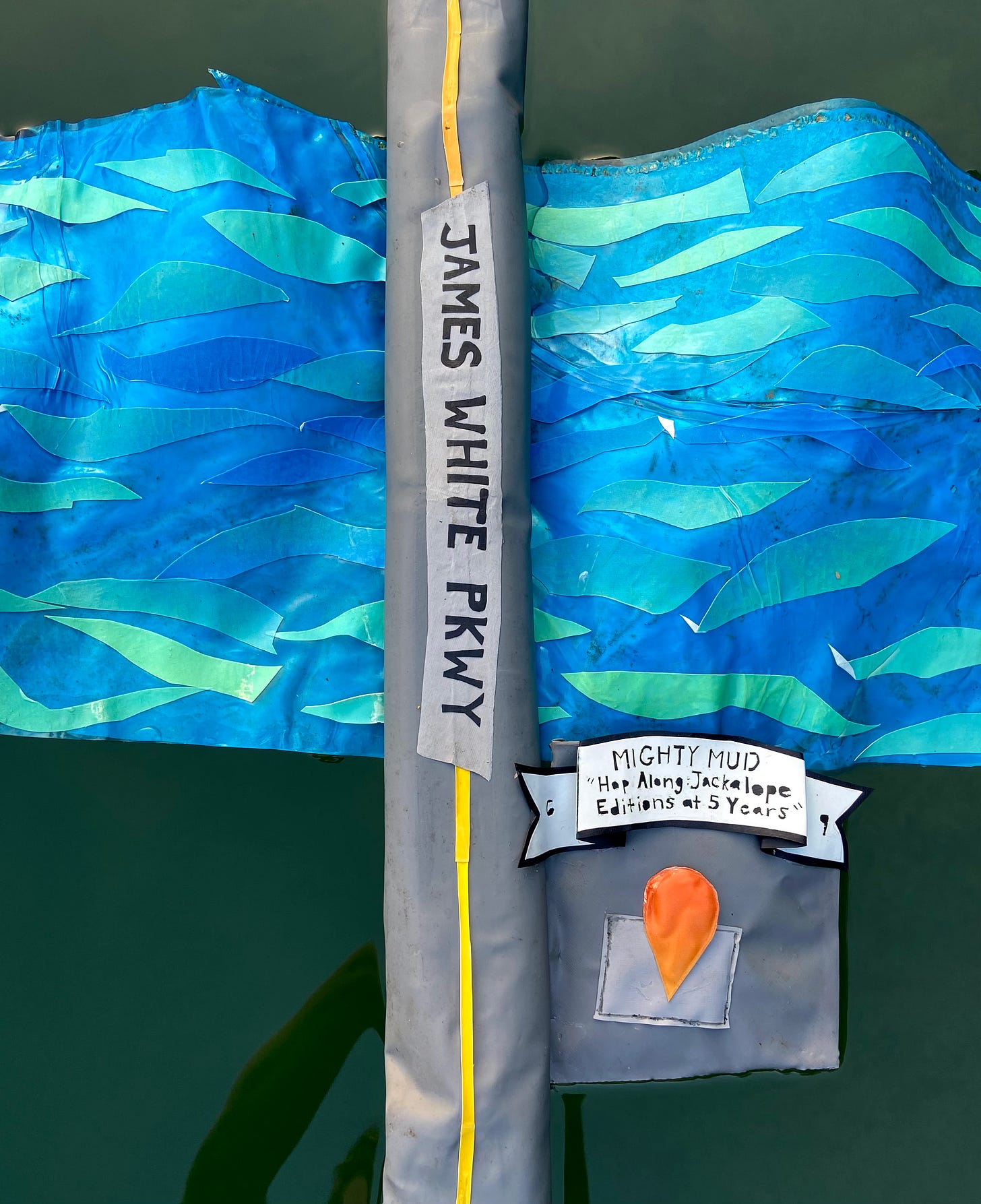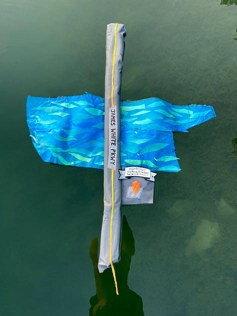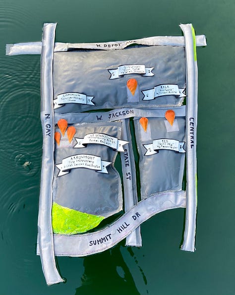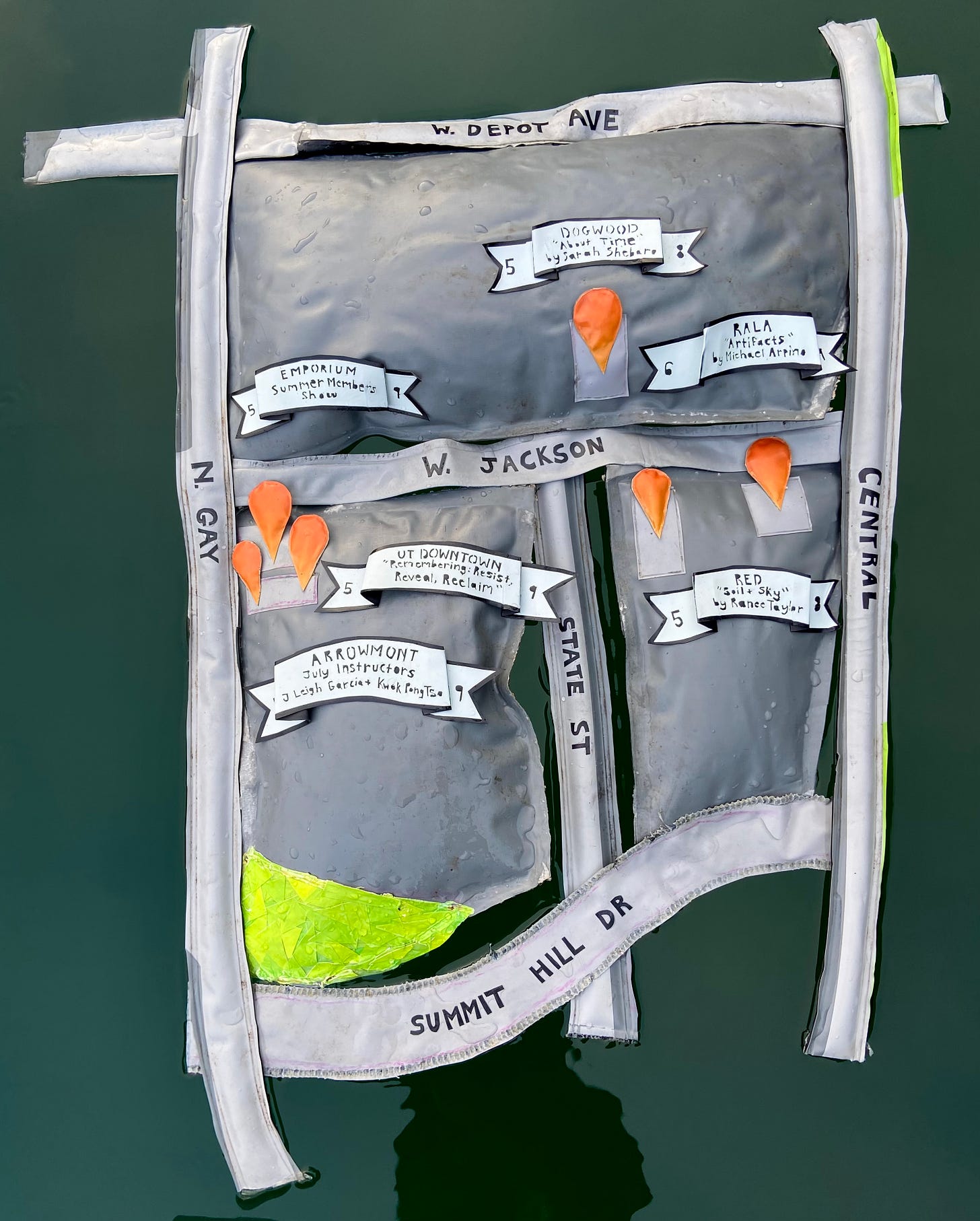 So here we are, with this inflatable-ish Second Friday map, made from four damaged and trashed floats, illegally floating in the quarry. The roads feature inserted bike tube valves from popped tubes. The letters on the banners and roads are painstakingly heat-carved or scissor-cut out of the float vinyl. I also made an auxiliary map for the lone Mighty Mud, holding down the wider-Knoxville First/Second Friday opening fort for the summer months.