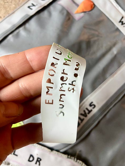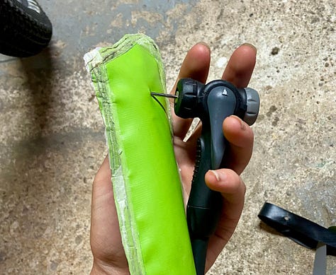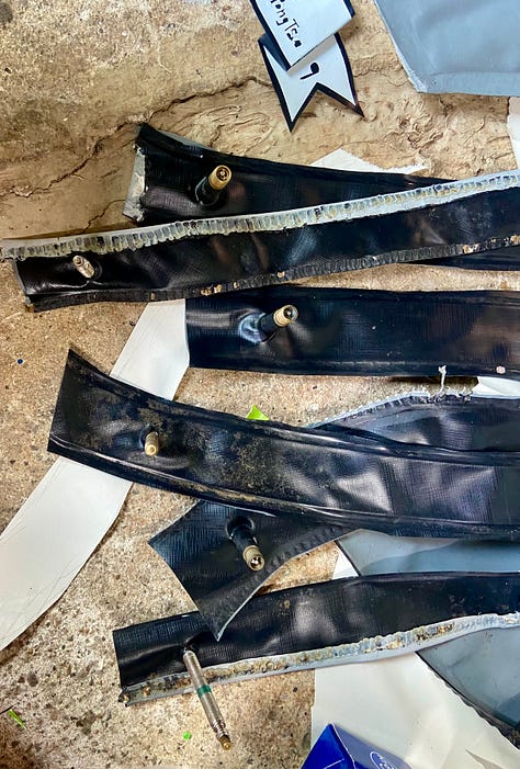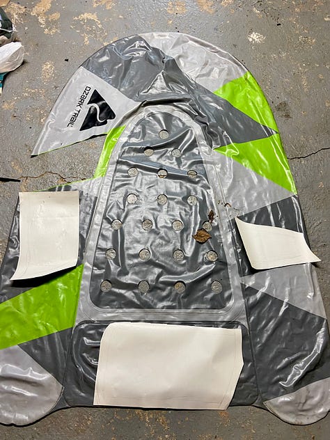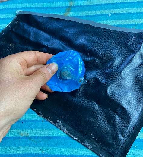 In order to make the shapes I needed, I had to cut segments of the floats and reassemble them. I basically needed to sew, but without poking hundreds of tiny holes… so I ended up using a combination of an iron and a wood burner. It was tricky—the iron made folds but wouldn’t usually fuse two pieces well enough, and the wood burner made the strongest seam-bond right before it burned through the vinyl, which would create a hole. It was challenging to do, and I definitely have a number of holes. Getting the valves into the roads was also a feat. I used Epoxy for the first time to seal the valves to the vinyl (worked!) and to seal up the open ends of the roads (did not work!).