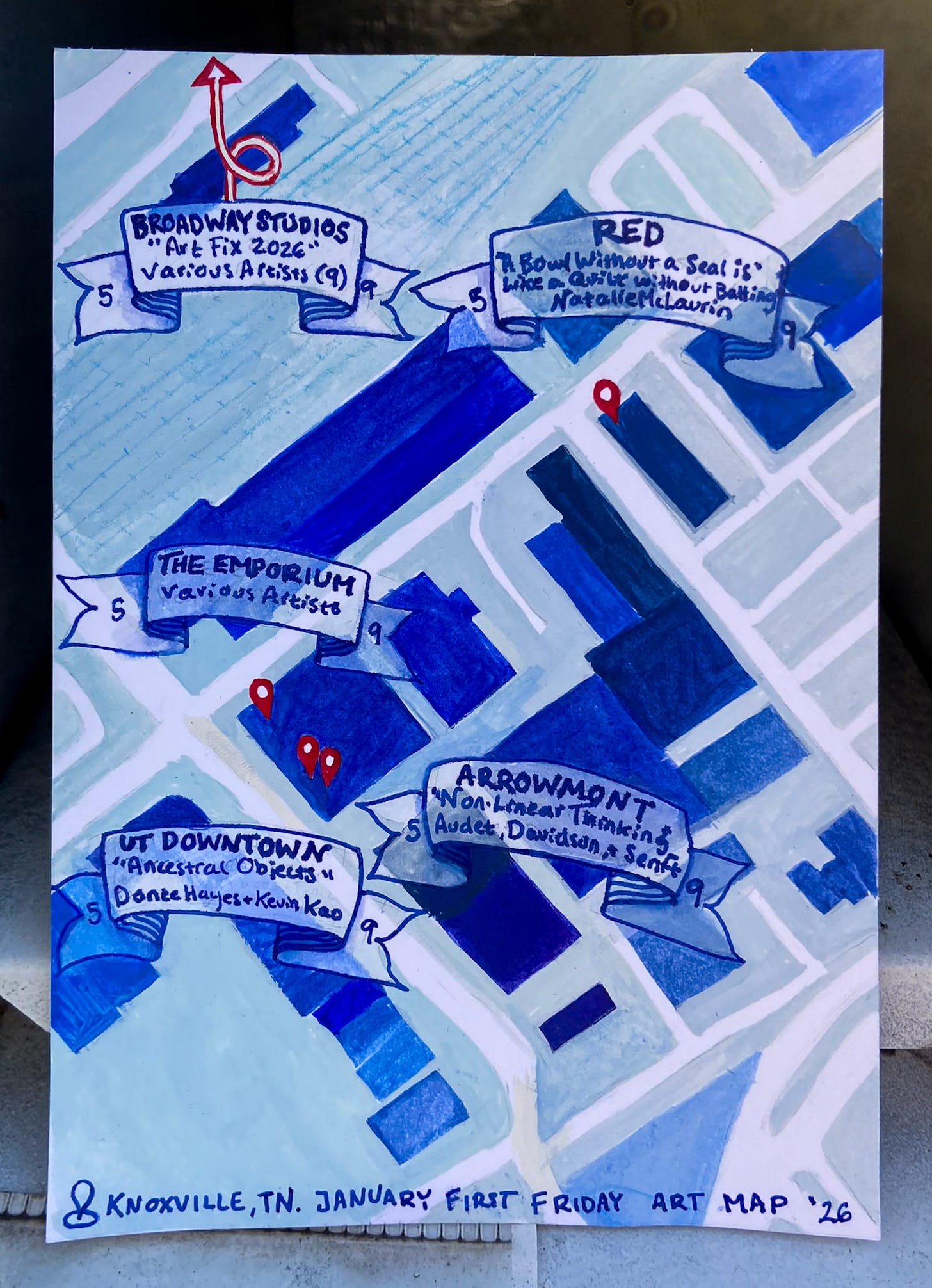 Other art maps for non-First Friday evenings go out to paid subscribers. I so appreciate your support <3 To chip in $1/month, click the “Annual” option.